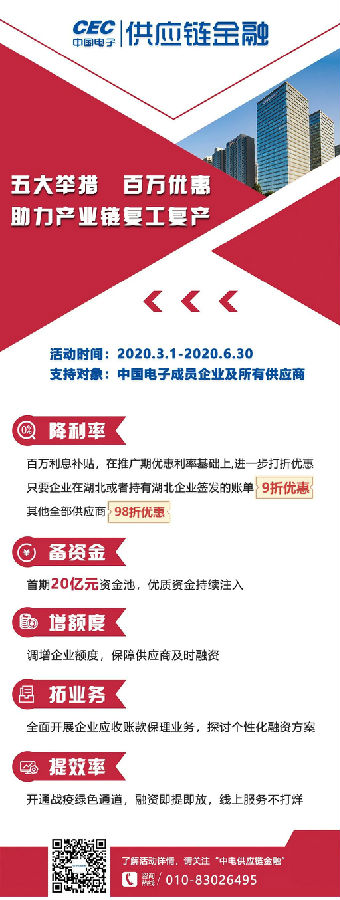 中電惠融通過降利率、備資金、增額度、拓業務、提效率五大舉措,開通戰疫綠色通道,為供應商減免百萬利息,高效解決供應商資金難題,在中國電子各企業有序復工復產的同時,通過高效的金融服務助力產業鏈中小企業協同復工復產。
